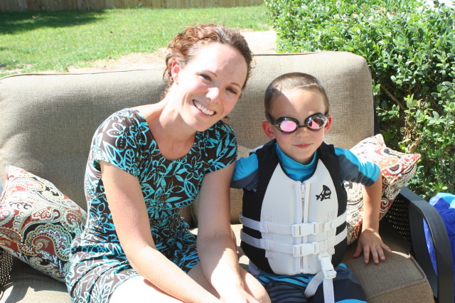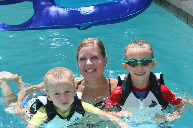The boys took swim lessons with Ms. Kadia.  During the boys’ swimming lessons, Katie spent time watching (quite pitifully!) from the back door or playing tea party.