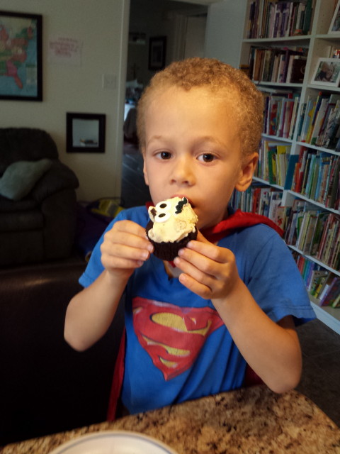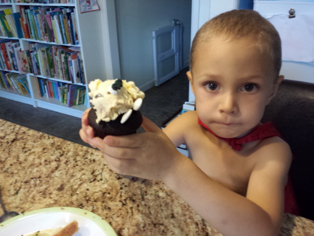We are celebrating…my birthday! The boys dressed me up (hence the purple bow), treated me to a special spa session (this spa uses A LOT of lotion), and humored me while decorating cupcakes with ice cream and toppings.