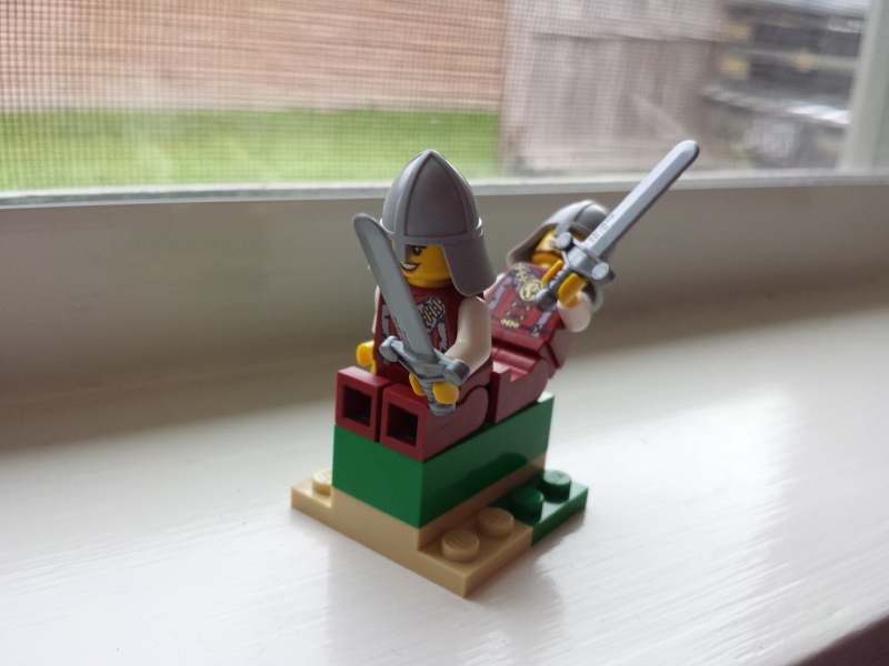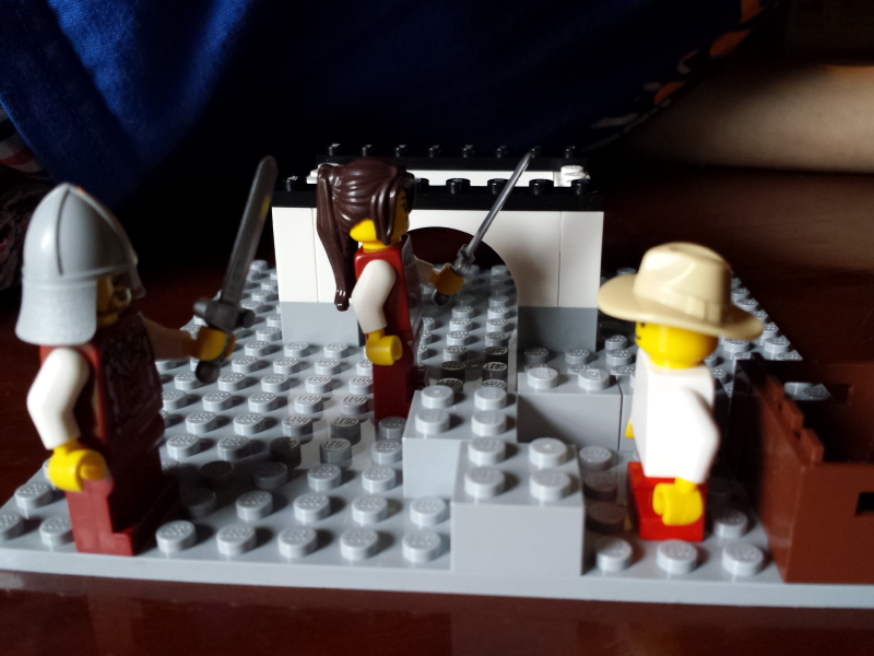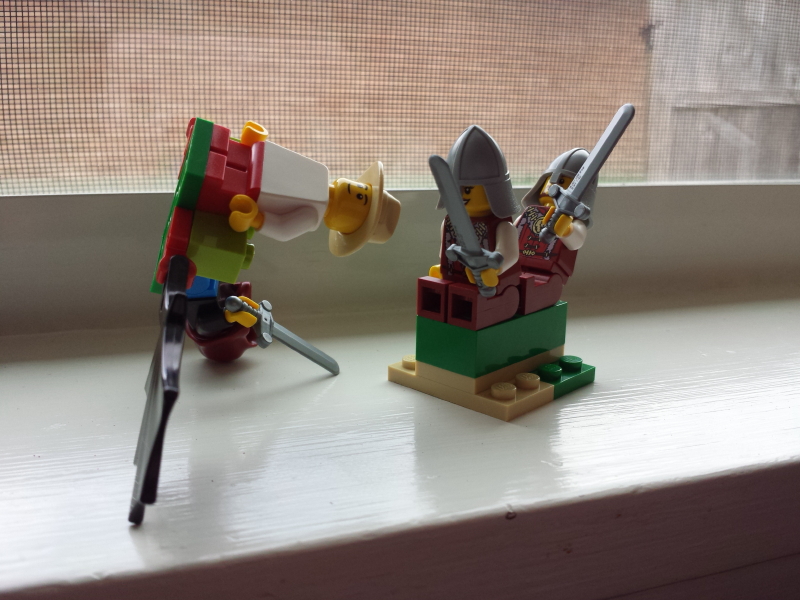 The good guys used their swords and cut off the wing of the evil dragon.  The dragon, with the villains on his back, spiraled to the ground.  The villains climbed off.  The heroes steered their dragon to the ground and then they climbed off.  The red-hooded villain revealed his sword, pulling it out, but the heroes already had their swords out and were ready to fight.  A battle began.June 2016 012_11_1 June 2016 013_12_1