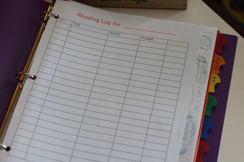 Joey and William’s books each contain a reading log and their daily “map”, as well as sections for memory work, hymns, art appreciation, music appreciation, drawing, map drill, physics, and bird study (our herb studies are recorded in our nature journals and their president studies will be recorded on a collection of Presidential “collector cards” that they’ll be making after each lesson).