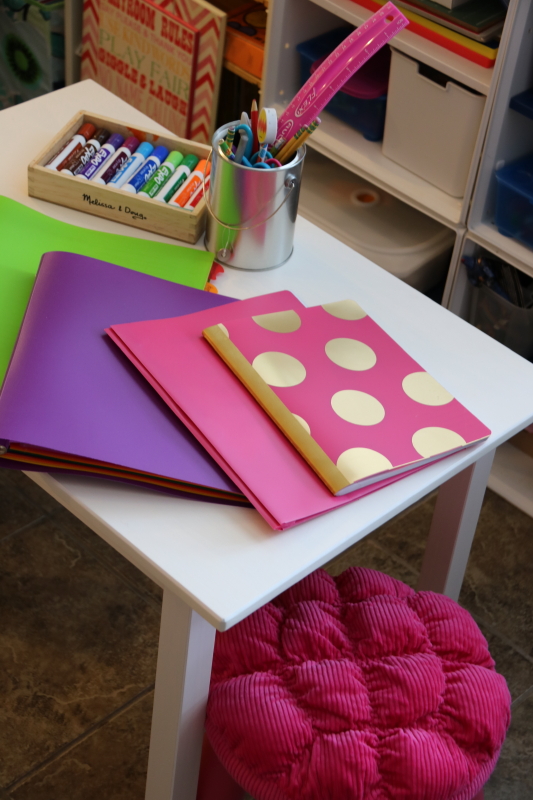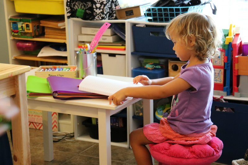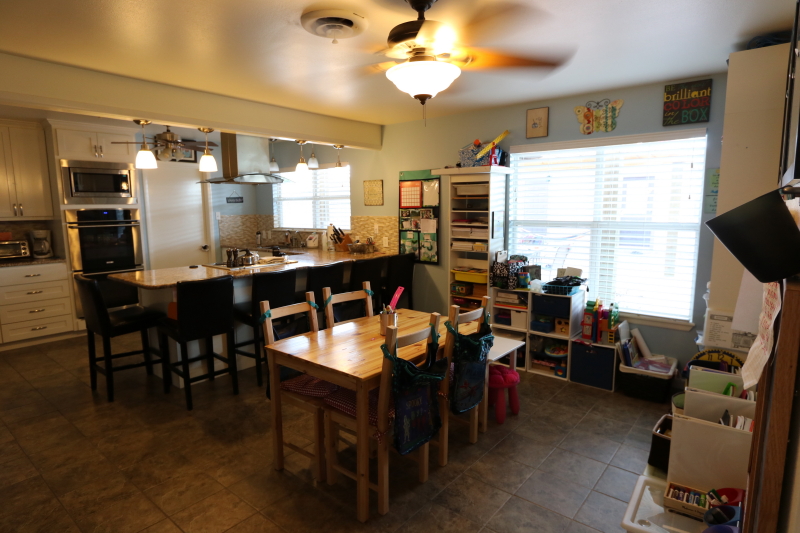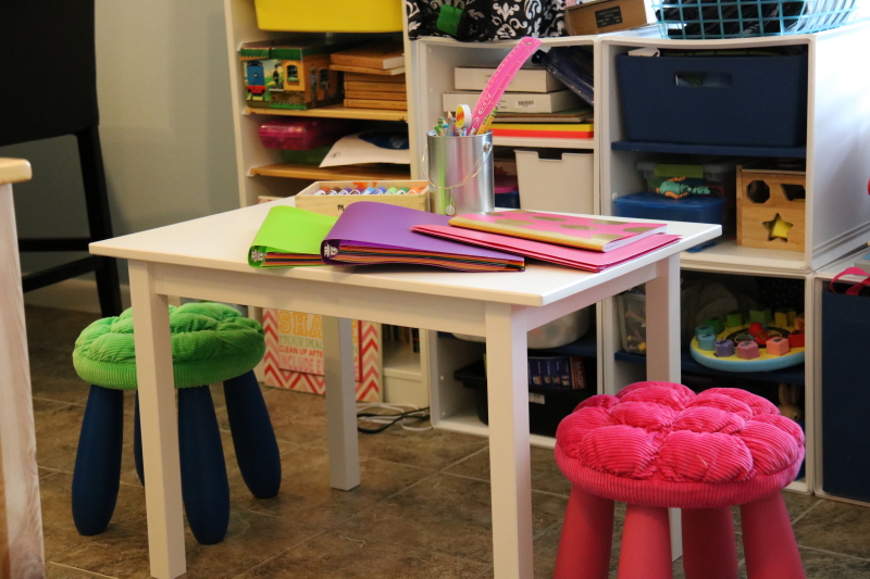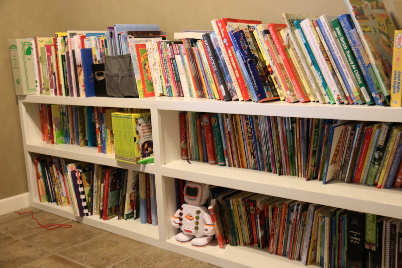 Our Classroom:  Since October 2014, we have had our schoolroom out in the back with Daxson’s office, but it’s been a bit impractical.  It’s a small room out there and since we were all confined to that tiny space together, it was hard for the big kids to concentrate while the little ones had a hard time playing quietly for extended periods of time.  So I moved us back into the house.  The schoolroom took over the playroom, booting the toys to various other places such as the living room and bedrooms (and still a few shelves of toys remain in the schoolroom).  I tried my best to make our schoolroom look like just another room in the house, but doggone it, it’s just in my blood to make a schoolroom look like a schoolroom.  At least no one will be confused as to which room is which.
