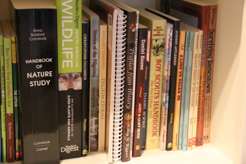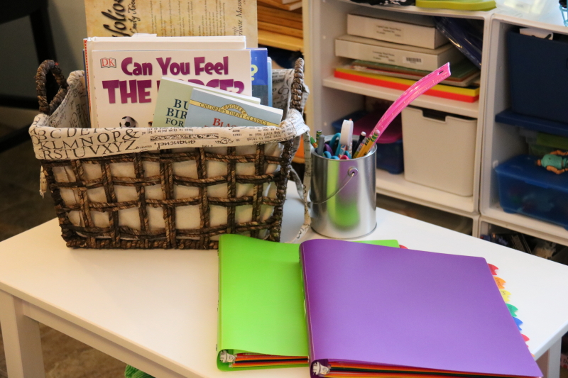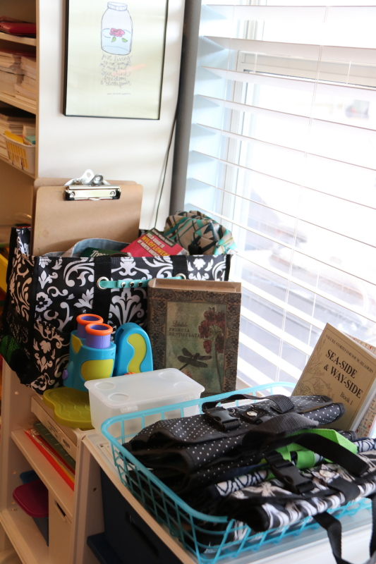 I was inspired by a friend in my local Charlotte Mason group to create a nature nook.  Our nook is on the top shelf of our manipulative/toy shelves, just under the window.  We hung the hummingbird feeder right outside the window and at some point we’ll replace our broken bird feeder.  I filled a bag with our nature study guides, magnifying glasses, binoculars, art supplies and clipboards.  It’s all in a bag so it’s portable…we can just grab it and head out the door.  We also have a small microscope and a treasure box for lucky nature finds (I think there are a few pressed flowers and sand-dollars in there right now).  July 2016 091_5_1 July 2016 023_2_1
