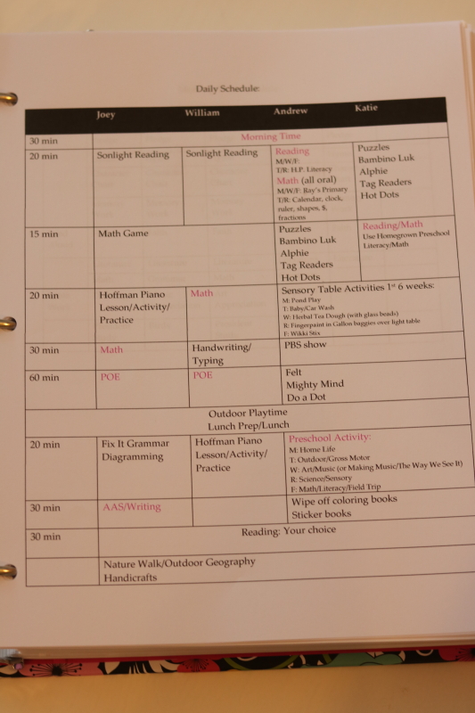 In the past we’ve always kept a family memory work notebook, but this year, in addition to that, I’ve also made Joey and William their own Morning Time notebooks.  Andrew and Katie each have a folder with a copy of the Good Morning Dear Jesus prayer, the Pledge of Allegiance, their character chart and a hundreds number chart.  Andrew’s also has a copy of Charlotte Mason’s Formidable List of Attainments.