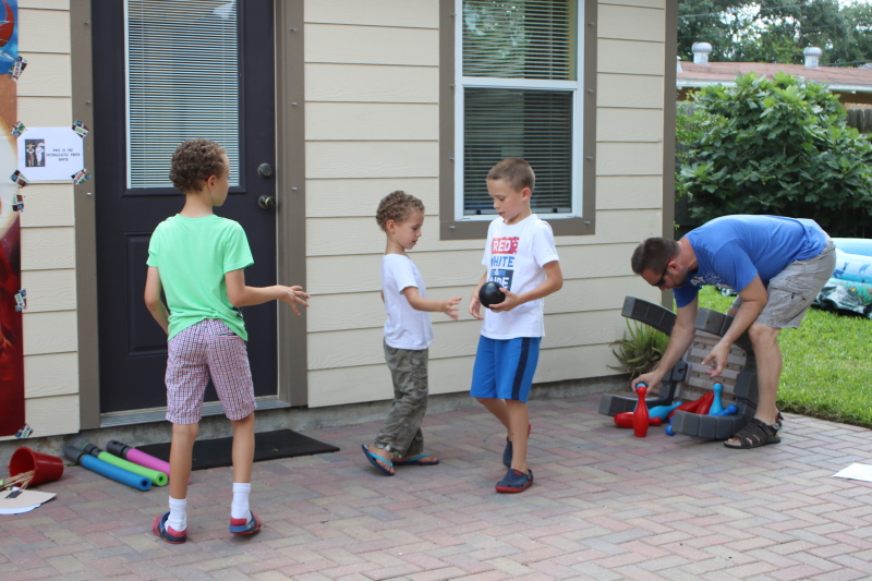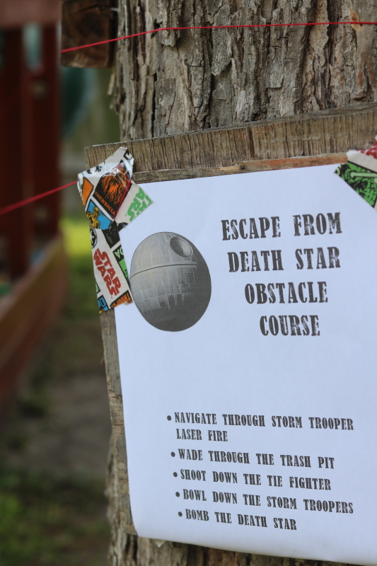 First they had to escape from the Death Star, which was an obstacle course that included navigating through storm trooper laser fire (red string strung up around the playset), wading through the trash pit (the pool filled with recycled trash), shooting down the tie fighter (using rubber bands to shoot at a poster of the tie fighter), bowling down storm troopers (literally bowling), and bombing the death star (tossing a ball into a bucket).  June 2016 006_1_1 June 2016 007_2_1 June 2016 018_3_1 June 2016 019_4_1 June 2016 020_1_1 June 2016 021_2_1 June 2016 022_3_1 June 2016 023_4_1 June 2016 026_5_1 June 2016 027_6_1