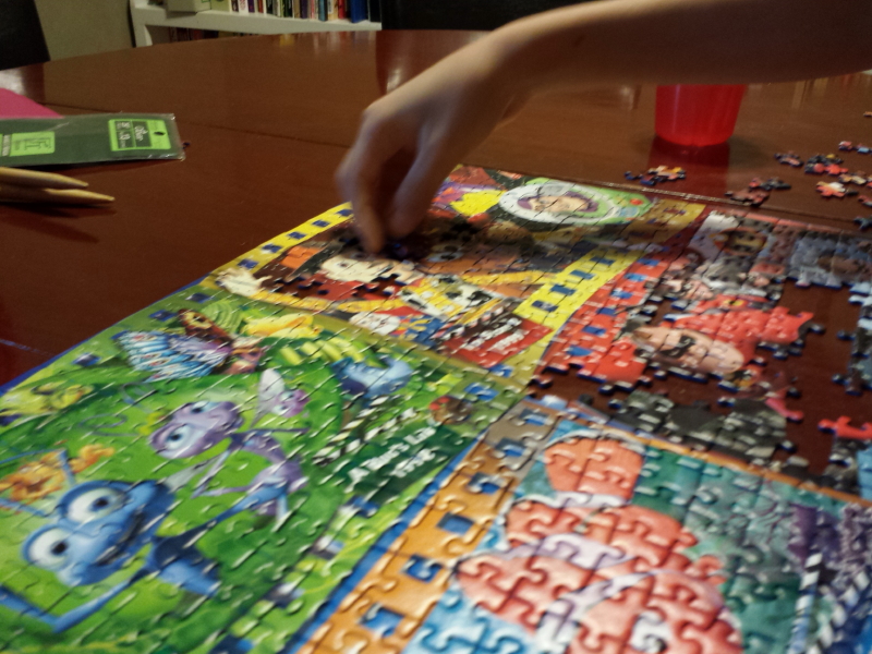 Mom would open up a new puzzle and spread the pieces out on the dining room table. It was an ideal place for a puzzle as the puzzle only took up a small space (our dining room table could easily have been considered for The Last Supper) on a table we only occasionally used (we had both a kitchen and dining room table) so we didn’t have to move it at the end of the day. The dining room table was always in the center of the house, a passing point for wherever I was going or wherever I’d been (and I have never been able to pass by a puzzle without trying to put in at least one piece). september-2016-086_2_1