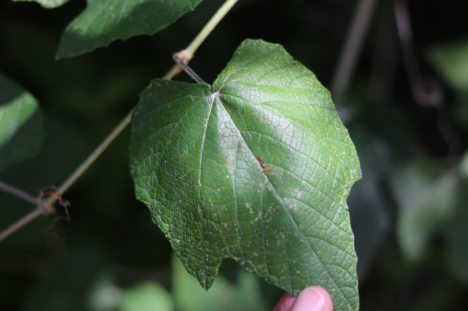 For the object lesson, I decided to focus mostly on Mustang grapes (which is a bit less fascinating than the Muscadine grapes but as they were Mustang grapes we had seen, I wanted to focus on what we could actually observe). Their leaves begin with five lobes and as they mature, the leaves become unlobed cordate shaped (heart-shaped) with a deep cleft in the base. Again, the leaves are fuzzy on top and bottom and they have a white underside. The leaf edges are toothed but not nearly so sharp toothed as the Muscadine. The leaves grow along the vine in an alternate pattern with opposing tendrils (the tendrils and teeth of the leaf are important in identification as the moonseed vine lacks both and the Virginia creeper adheres rather than entwines…this helps you avoid the poisonous look-alikes!)