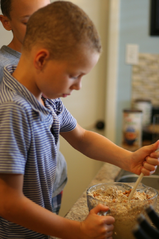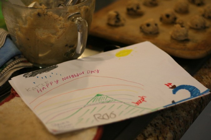 The kids spent the morning baking cookies…which ended up being a bake-off sponsored by Andrew…winner got a free back rub from him {which is seriously a prize worth winning!}. The boys won with their butterscotch cookies…apparently butterscotch chips were much more exciting than the chocolate chips that Katie and I used (personally I preferred the chocolate chip cookies, but that could be my jealousy talking…I was really hoping to win that back rub). The afternoon was spent making pictures and decorating notes to tell our neighbors just how much we love them. Of course, the best part was delivering it all.
