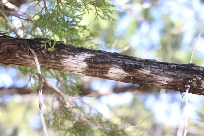 Ashe Junipers are multi-trunked (making it easy to differentiate between the Ashe Juniper and the single-trunked Eastern Red Juniper, both of which have blue fruit; the other Junipers in Texas have red fruit). The bark of the Ashe Juniper is seriously so fun! It flakes off in long strips which makes it an enticing find for the rare Golden Cheeked Warblers who use it to make their nests. The bark also has white rings on it (again, unlike the Eastern Red Juniper), which is why it is commonly referred to as white cedar.