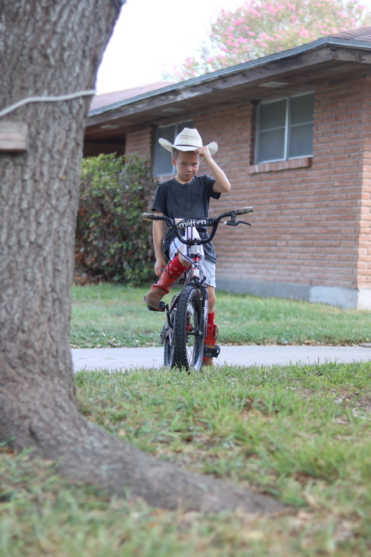 I am watching…a reenactment of Clint Eastwood. He’s got the moves down but I’m pretty sure if he addresses me by fair lady once more, I’m going to have to look into that. I just can’t imagine Clint Eastwood approaching a woman and asking, “How goes it here my fair lady?” I think we’re getting our heroes confused. (By the way, the paper on the front of the bike is a hand drawn horse’s head…because that’s clearly not his bike, it’s his horse, of course.)