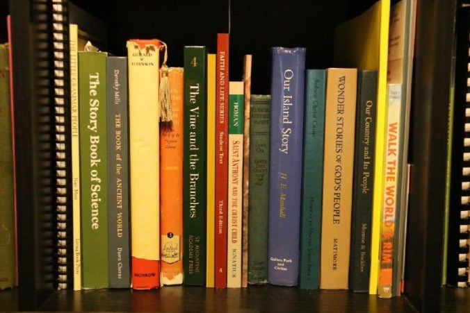 I am reading…a whole lot of random books.  Random only in that I feel a little all over the place as far as what I’m reading to stay ahead of my kids.  Not random as in unplanned.  All of the books on each of the school shelves this year are there on purpose…lots of thought and love went into planning book lists this year thanks to my ADE consultation and any tweaks I made using The Plenary’s form guides.   (These photos do not do credit to the rich and beautiful education my children are receiving.  Charlotte Mason is about so much more than just a list of books.  Thanks to the suggestions of wise folks like the ladies at ADE and Rachel over at A CM Plenary, our year is bound to be a journey that takes us all a little deeper in our educations…it is full of the good, the truth and the beauty.  The books pictured here are only the tip of the iceberg for us.  )